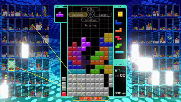 “K.O.s” targets players whose blocks are stacking up high and appear to be close to topping out. It’s an opportunistic and somewhat merciless strategy of kicking people while they’re down, but there is a point to it. If your garbage blocks push a player over the edge and takes them out of the game, you score a Knock-Out. Once you rack up a few KOs, your mercenary efficiency will be rewarded with badges. (More on that in a sec.)